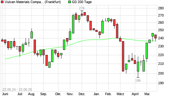 Mit dem Rücksetzer auf 236,00 EUR hat die Vulcan Materials Company-Aktie am 21.05.2025 die 200-Tage-Linie nach unten gekreuzt.Die Vulcan Materials Company-Aktie befand sich seit dem 15.05.2025 ...weiterlesen