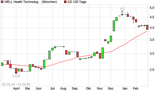 Mit dem Rücksetzer auf 3,73 EUR hat die WELL HEALTH TECHS-Aktie am 28.02.2025 die 100-Tage-Linie nach unten gekreuzt.