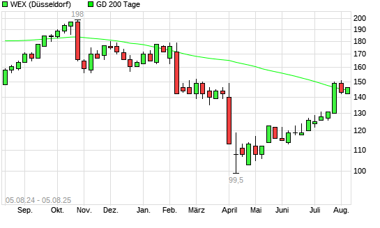 Mit dem Rücksetzer auf 142,00 EUR hat die WEX-Aktie am 04.08.2025 die 200-Tage-Linie nach unten gekreuzt.