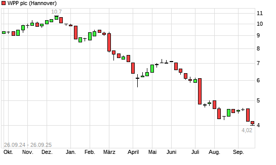 Mit dem Rücksetzer auf 4,04 EUR hat die WPP-Aktie (ISIN JE00B8KF9B49) am 25.09.2025 ein neues 10-Jahres-Tief erreicht und damit den Kurs vom 23.09.2025 eingestellt.