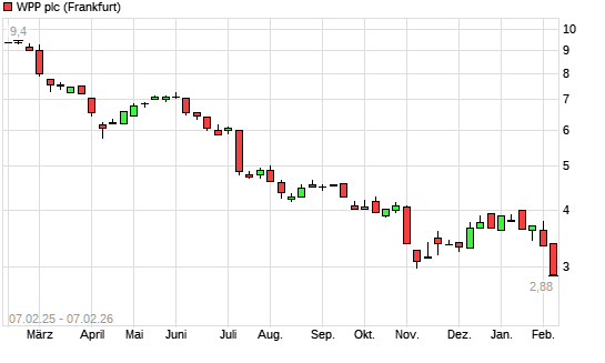 Mit dem Rücksetzer auf 2,88 EUR hat die WPP-Aktie (ISIN JE00B8KF9B49) am 06.02.2026 ein neues All-Time-Low erreicht und damit den Kurs vom 05.02.2026 eingestellt.