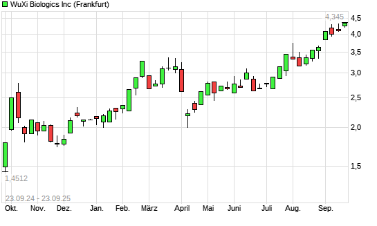 Mit dem Anstieg auf 4,35 EUR hat die WUXI BIOLOGICS-Aktie (ISIN KYG970081173) am 22.09.2025 ein neues 12-Monats-Hoch erreicht und damit den Kurs vom 17.09.2025 eingestellt.