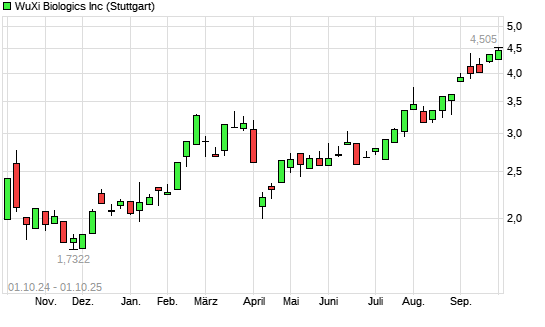 Mit dem Anstieg auf 4,45 EUR hat die WUXI BIOLOGICS-Aktie (ISIN KYG970081173) am 30.09.2025 ein neues 12-Monats-Hoch erreicht und damit den Kurs vom 22.09.2025 eingestellt.