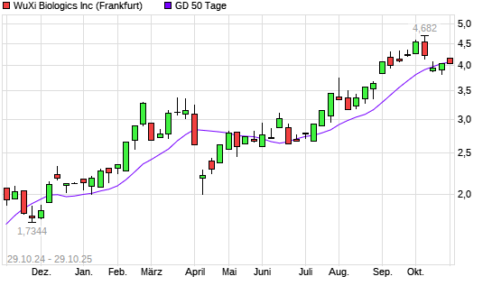 Mit dem Rücksetzer auf 4,03 EUR hat die WUXI BIOLOGICS-Aktie am 28.10.2025 die 50-Tage-Linie nach unten gekreuzt.Die WUXI BIOLOGICS-Aktie befindet sich seit dem 30.09.2024 im langfristigen ...weiterlesen