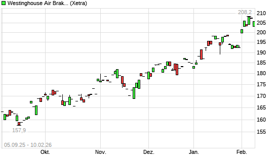 Mit dem Anstieg auf 215,00 EUR hat die Wabtec-Aktie (ISIN US9297401088) am 11.02.2026 ein neues All-Time-High erreicht und damit den Kurs vom 09.02.2026 eingestellt.