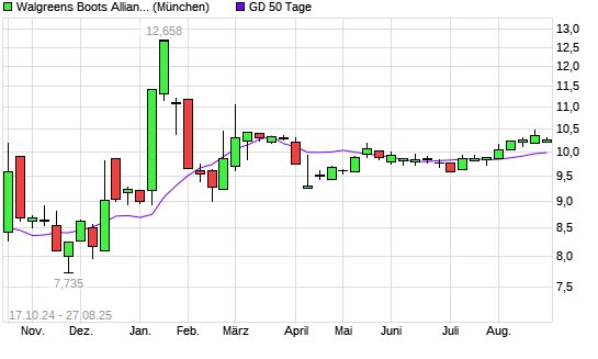 Mit dem Rücksetzer auf 10,25 EUR hat die Walgreens Boots Alliance-Aktie am 16.10.2025 die 50-Tage-Linie nach unten gekreuzt.