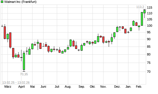 Mit dem Anstieg auf 113,20 EUR hat die Walmart-Aktie (ISIN US9311421039) am 12.02.2026 ein neues All-Time-High erreicht und damit den Kurs vom 06.02.2026 eingestellt.