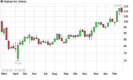 Mit dem Anstieg auf 113,26 EUR hat die Walmart-Aktie (ISIN US9311421039) am 16.02.2026 ein neues All-Time-High erreicht und damit den Kurs vom 13.02.2026 eingestellt.