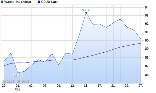 Mit dem Rücksetzer auf 89,70 EUR hat die Walmart-Aktie am 27.10.2025 die 20-Tage-Linie nach unten gekreuzt.