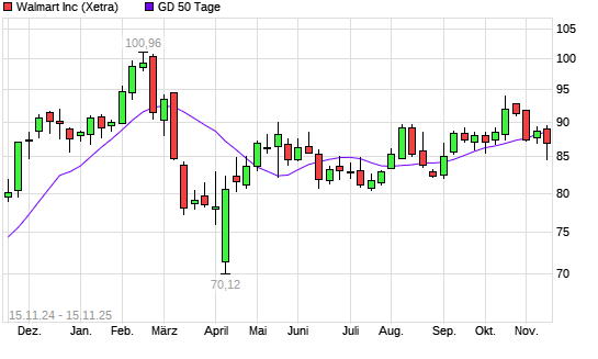 Mit dem Rücksetzer auf 88,12 EUR hat die Walmart-Aktie am 14.11.2025 die 50-Tage-Linie nach unten gekreuzt.