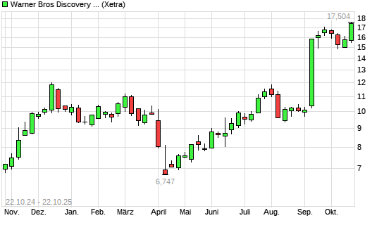 Mit dem Anstieg auf 17,20 EUR hat die Warner Bros Discovery-Aktie (ISIN US9344231041) am 21.10.2025 ein neues 3-Jahres-Hoch erreicht und damit den Kurs vom 25.09.2025 eingestellt.