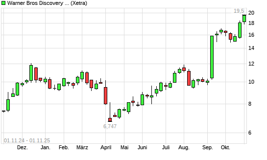 Mit dem Anstieg auf 19,30 EUR hat die Warner Bros Discovery-Aktie (ISIN US9344231041) am 31.10.2025 ein neues 3-Jahres-Hoch erreicht und damit den Kurs vom 30.10.2025 eingestellt.