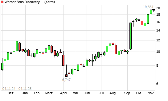 Mit dem Anstieg auf 19,35 EUR hat die Warner Bros Discovery-Aktie (ISIN US9344231041) am 03.11.2025 ein neues 3-Jahres-Hoch erreicht und damit den Kurs vom 31.10.2025 eingestellt.