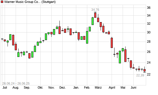 Mit dem Rücksetzer auf 22,39 EUR hat die Warner Music Group-Aktie (ISIN US9345502036) am 25.06.2025 ein neues 3-Jahres-Tief erreicht und damit den Kurs vom 05.06.2023 eingestellt.