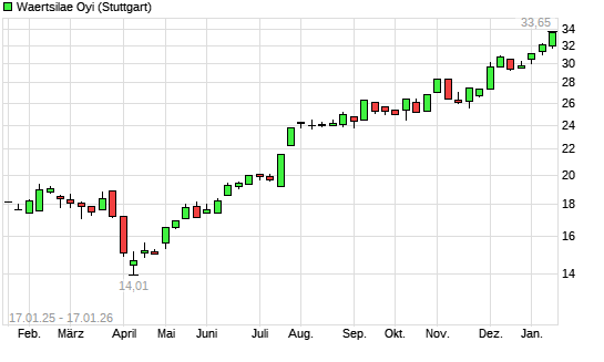 Mit dem Anstieg auf 33,36 EUR hat die Wartsila B-Aktie (ISIN FI0009003727) am 16.01.2026 ein neues All-Time-High erreicht und damit den Kurs vom 15.01.2026 eingestellt.