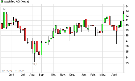Mit dem Anstieg auf 42,50 EUR hat die WashTec-Aktie (ISIN DE0007507501) am 30.04.2025 ein neues 12-Monats-Hoch erreicht und damit den Kurs vom 14.03.2025 eingestellt.
