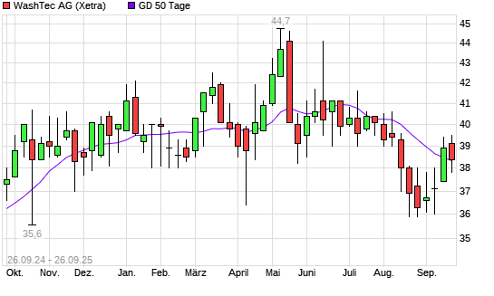 Mit dem Rücksetzer auf 37,70 EUR hat die WashTec-Aktie am 25.09.2025 die 50-Tage-Linie nach unten gekreuzt.
