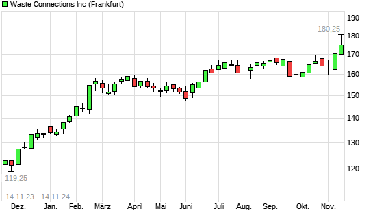 Mit dem Anstieg auf 178,00 EUR hat die Waste Connections-Aktie (ISIN CA94106B1013) am 13.11.2024 ein neues All-Time-High erreicht und damit den Kurs vom 12.11.2024 eingestellt.