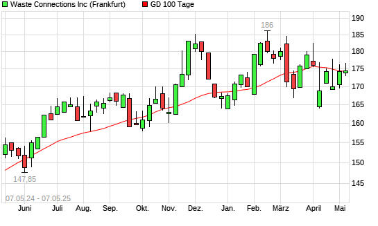 Mit dem Anstieg auf 174,50 EUR hat die Waste Connections-Aktie am 06.05.2025 die 100-Tage-Linie nach oben gekreuzt.