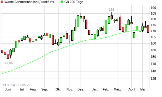 Mit dem Rücksetzer auf 165,35 EUR hat die Waste Connections-Aktie am 12.05.2025 die 200-Tage-Linie nach unten gekreuzt.