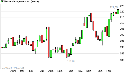 Mit dem Anstieg auf 222,05 EUR hat die Waste Management-Aktie (ISIN US94106L1098) am 28.02.2025 ein neues All-Time-High erreicht und damit den Kurs vom 27.02.2025 eingestellt.