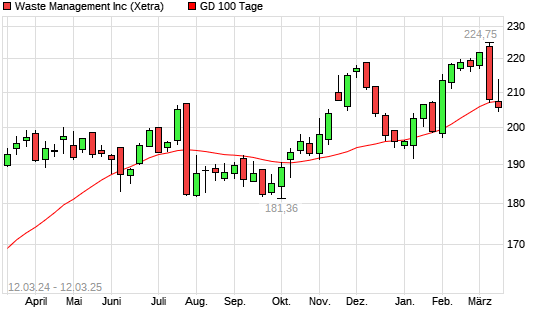 Mit dem Rücksetzer auf 205,00 EUR hat die Waste Management-Aktie am 11.03.2025 die 100-Tage-Linie nach unten gekreuzt.