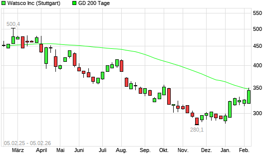 Mit dem Anstieg auf 346,40 EUR hat die Watsco A-Aktie am 04.02.2026 die 200-Tage-Linie nach oben gekreuzt.