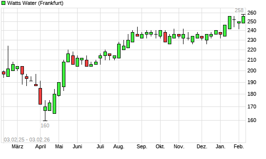 Mit dem Anstieg auf 258,00 EUR hat die Watts Water-Aktie (ISIN US9427491025) am 02.02.2026 ein neues All-Time-High erreicht und damit den Kurs vom 16.01.2026 eingestellt.