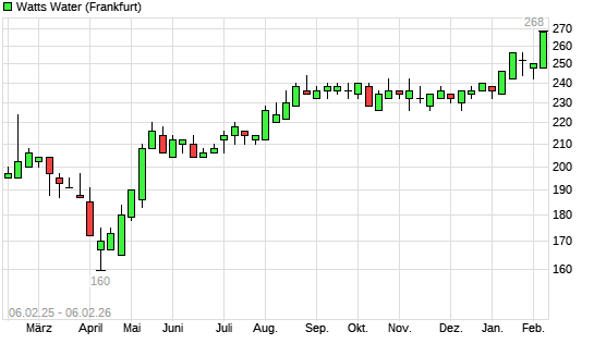 Mit dem Anstieg auf 262,00 EUR hat die Watts Water-Aktie (ISIN US9427491025) am 05.02.2026 ein neues All-Time-High erreicht und damit den Kurs vom 04.02.2026 eingestellt.