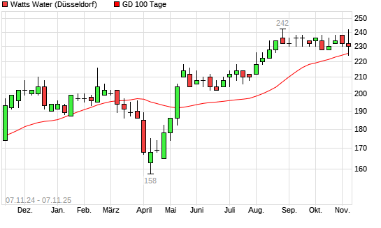 Mit dem Rücksetzer auf 228,00 EUR hat die Watts Water-Aktie am 06.11.2025 die 100-Tage-Linie nach unten gekreuzt.