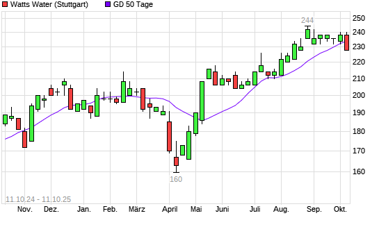 Mit dem Rücksetzer auf 228,00 EUR hat die Watts Water-Aktie am 10.10.2025 die 50-Tage-Linie nach unten gekreuzt.
