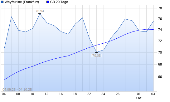 Mit dem Anstieg auf 75,60 EUR hat die Wayfair A-Aktie am 03.10.2025 die 20-Tage-Linie nach oben gekreuzt.