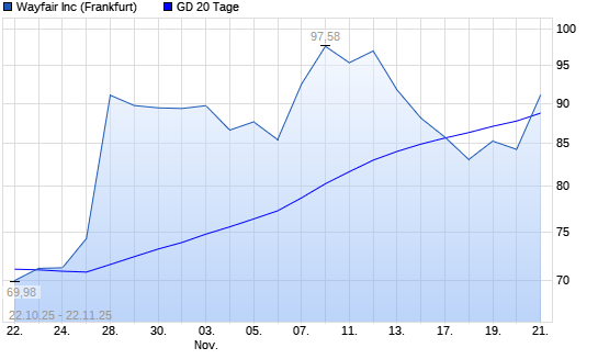 Mit dem Anstieg auf 91,04 EUR hat die Wayfair A-Aktie am 21.11.2025 die 20-Tage-Linie nach oben gekreuzt.