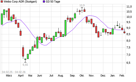 Mit dem Rücksetzer auf 8,60 EUR hat die Weibo Corporation ADR-Aktie am 03.02.2026 die 50-Tage-Linie nach unten gekreuzt.