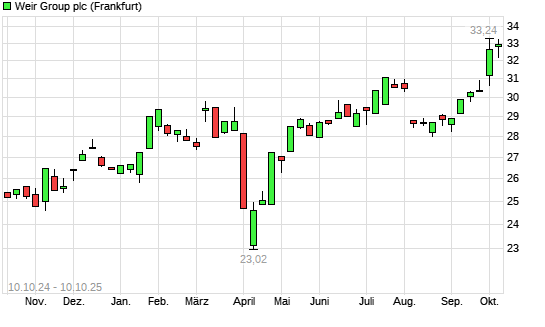 Mit dem Anstieg auf 33,22 EUR hat die Weir Group-Aktie (ISIN GB0009465807) am 09.10.2025 ein neues 10-Jahres-Hoch erreicht und damit den Kurs vom 06.10.2025 eingestellt.