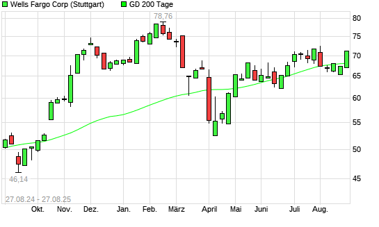 Mit dem Anstieg auf 68,20 EUR hat die Wells Fargo-Aktie am 26.08.2025 die 200-Tage-Linie nach oben gekreuzt.