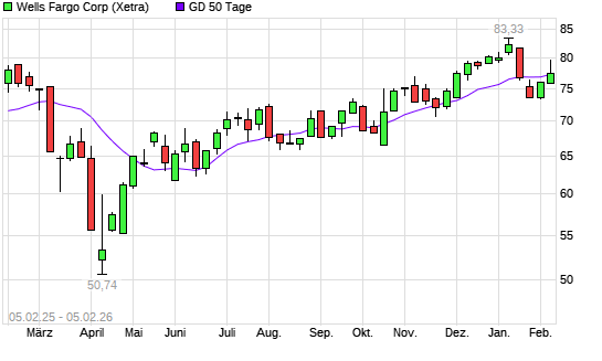 Mit dem Rücksetzer auf 77,45 EUR hat die Wells Fargo-Aktie am 04.02.2026 die 50-Tage-Linie nach unten gekreuzt.