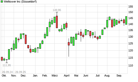 Mit dem Anstieg auf 147,20 EUR hat die Welltower-Aktie (ISIN US95040Q1040) am 25.09.2025 ein neues 6-Monats-Hoch erreicht und damit den Kurs vom 05.08.2025 eingestellt.
