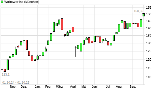 Mit dem Anstieg auf 151,20 EUR hat die Welltower-Aktie (ISIN US95040Q1040) am 30.09.2025 ein neues All-Time-High erreicht und damit den Kurs vom 29.09.2025 eingestellt.