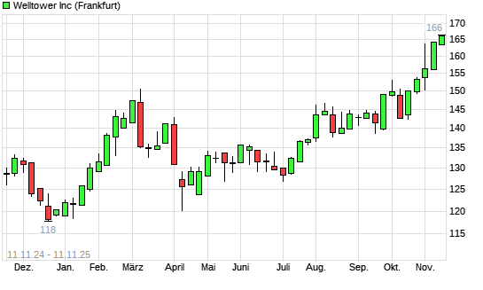 Mit dem Anstieg auf 165,40 EUR hat die Welltower-Aktie (ISIN US95040Q1040) am 10.11.2025 ein neues All-Time-High erreicht und damit den Kurs vom 07.11.2025 eingestellt.