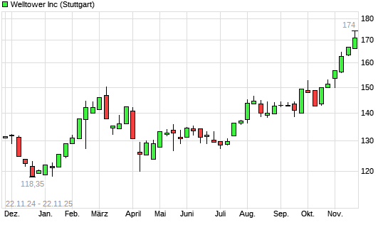 Mit dem Anstieg auf 173,30 EUR hat die Welltower-Aktie (ISIN US95040Q1040) am 21.11.2025 ein neues All-Time-High erreicht und damit den Kurs vom 20.11.2025 eingestellt.