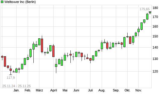 Mit dem Anstieg auf 175,60 EUR hat die Welltower-Aktie (ISIN US95040Q1040) am 24.11.2025 ein neues All-Time-High erreicht und damit den Kurs vom 21.11.2025 eingestellt.