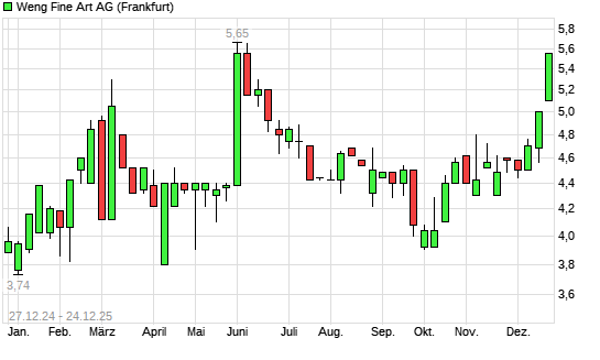 Mit dem Anstieg auf 5,55 EUR hat die Weng Fine Art-Aktie (ISIN DE0005181606) am 23.12.2025 ein neues 6-Monats-Hoch erreicht und damit den Kurs vom 22.12.2025 eingestellt.