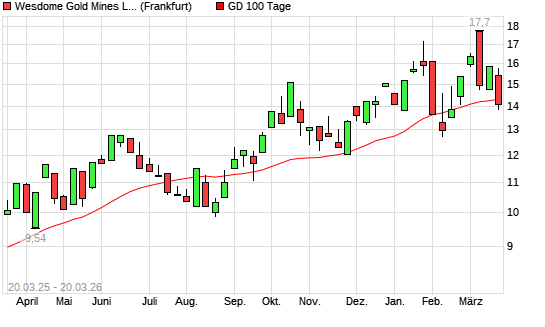 Mit dem Rücksetzer auf 13,85 EUR hat die Wesdome Gold Mines-Aktie am 19.03.2026 die 100-Tage-Linie nach unten gekreuzt.