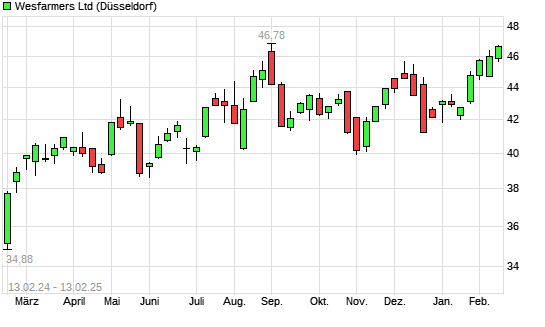 Mit dem Anstieg auf 46,99 EUR hat die Wesfarmers-Aktie (ISIN AU000000WES1) am 12.02.2025 ein neues All-Time-High erreicht und damit den Kurs vom 28.08.2024 eingestellt.