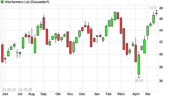 Mit dem Anstieg auf 47,53 EUR hat die Wesfarmers-Aktie (ISIN AU000000WES1) am 20.05.2025 ein neues All-Time-High erreicht und damit den Kurs vom 14.02.2025 eingestellt.