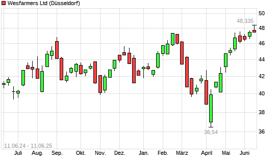 Mit dem Anstieg auf 48,57 EUR hat die Wesfarmers-Aktie (ISIN AU000000WES1) am 10.06.2025 ein neues All-Time-High erreicht und damit den Kurs vom 05.06.2025 eingestellt.