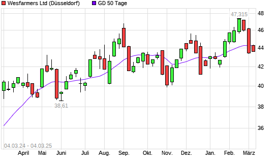 Mit dem Anstieg auf 44,77 EUR hat die Wesfarmers-Aktie am 03.03.2025 die 50-Tage-Linie nach oben gekreuzt.