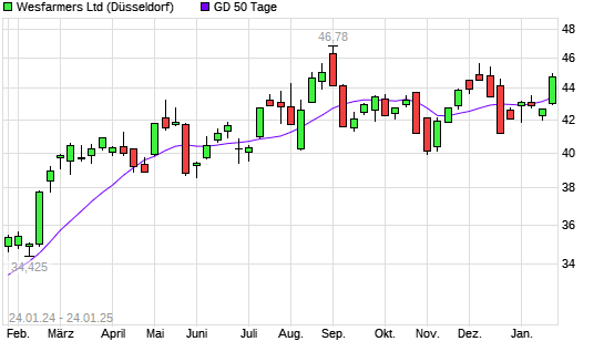 Mit dem Rücksetzer auf 43,46 EUR hat die Wesfarmers-Aktie am 23.01.2025 die 50-Tage-Linie nach unten gekreuzt.