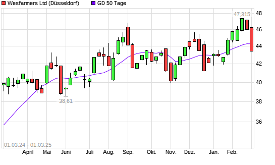 Mit dem Rücksetzer auf 44,24 EUR hat die Wesfarmers-Aktie am 28.02.2025 die 50-Tage-Linie nach unten gekreuzt.